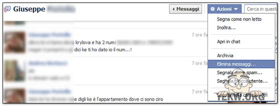 2. Si aprirà la conversazione, quindi cliccate su Azioni e dal menu a tendina che si apre su Elimina messaggi (vedi screen sottostante);