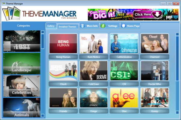 I temi sono mostrati in gruppi sul lato sinistro. Vengono divisi in categorie come TV, Celebrità, Animali, Auto o Giochi. Un clic su un gruppo apre i temi disponibili sul lato destro in modalità anteprima. Ogni tema viene elencato con il suo nome e con un’immagine di anteprima. Un clic su un tema nell’elenco e lo scarichiamo nel nostro pc senza problemi. Il tema selezionato e scaricato viene installato direttamente. Non c’è altra possibilità di scaricare temi senza installarli.